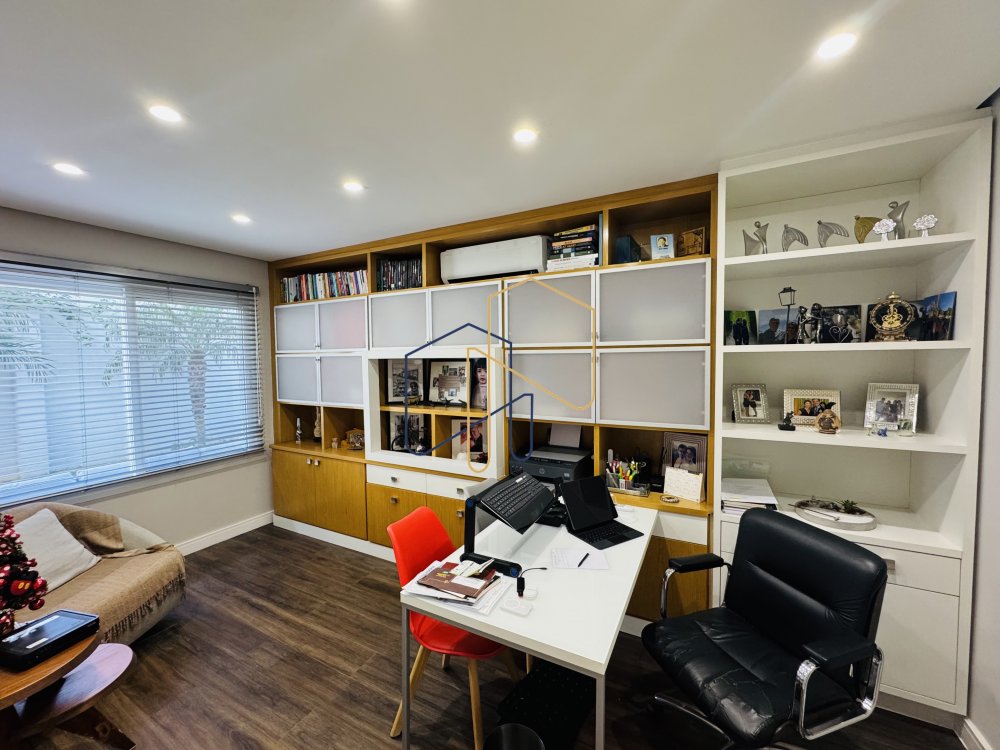 No térreo, a casa oferece uma ampla sala de visitas com lareira, integrada à sala de jantar e à cozinha aberta, criando um ambiente acolhedor e funcional. Um escritório espaçoso e uma sala de TV/cinema garantem conforto e praticidade. O andar também conta com lavabo, banheiro social, banheiro de serviço, quarto de apoio e garagem privativa para quatro carros, sendo três vagas internas com portão automático e uma externa.