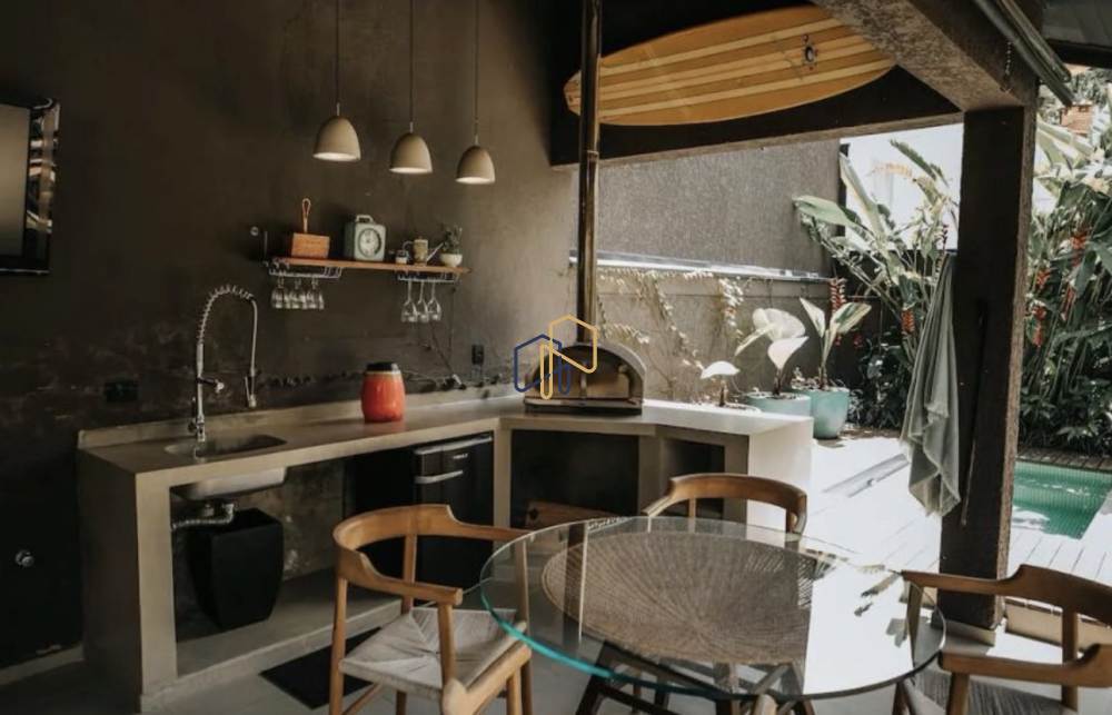 A área externa é um dos destaques, com paisagismo tropical, piscina e jacuzzi aquecidas, além de uma charmosa área gourmet com forno de pizza.