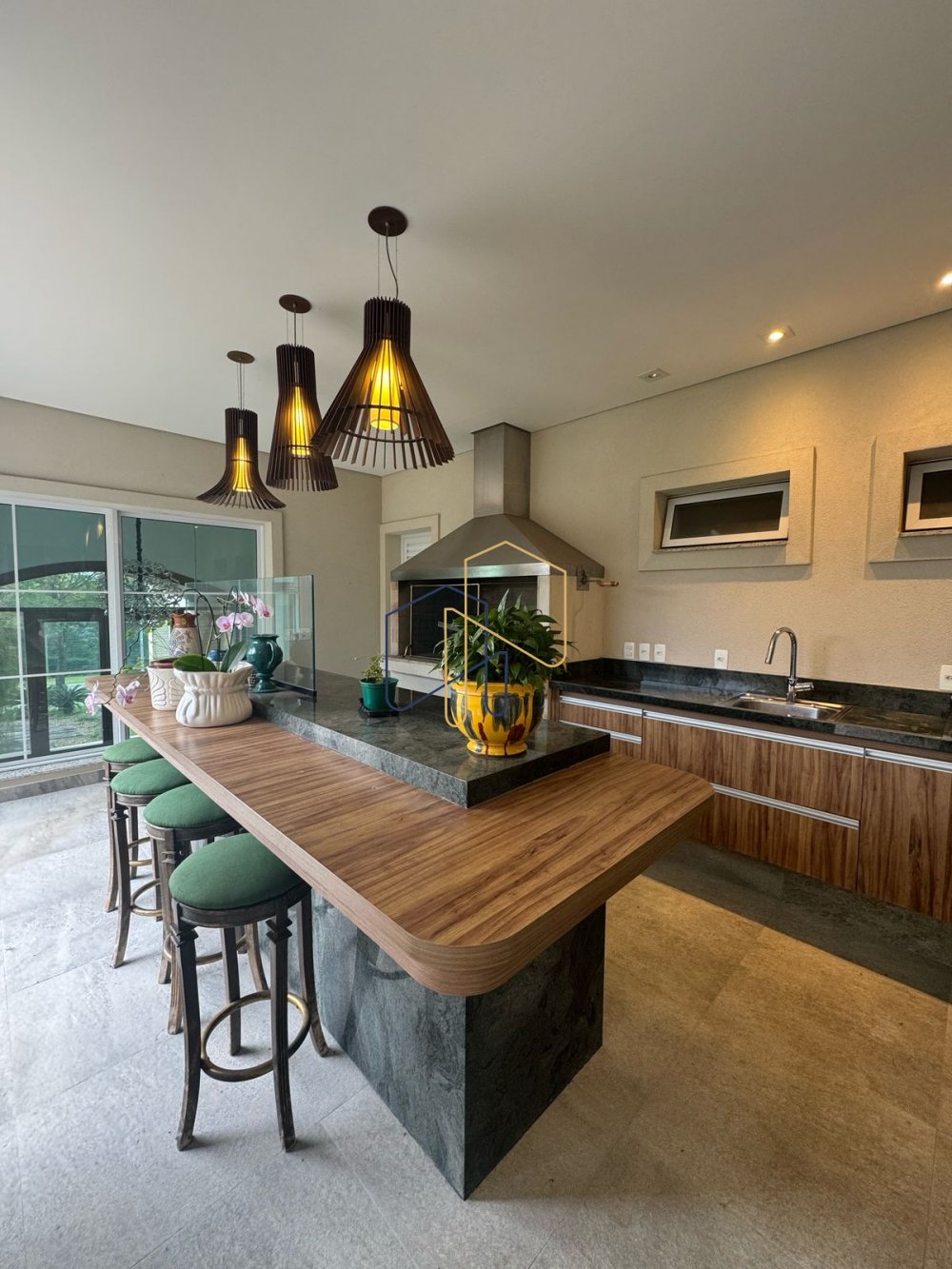 Churrasqueira uruguaia com pia e armários