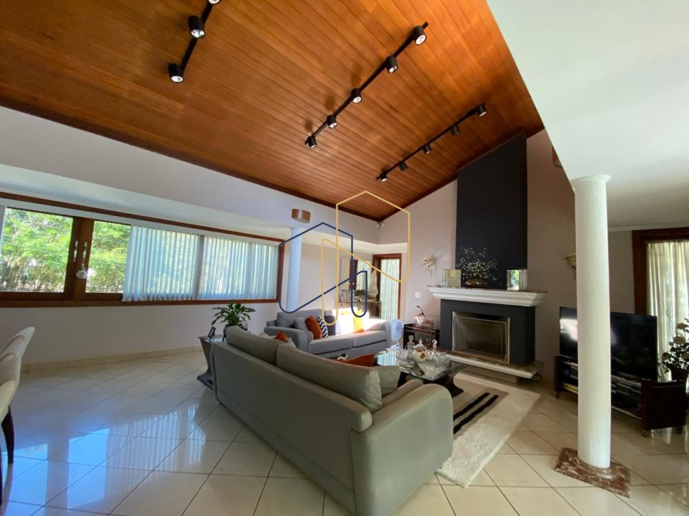 Sala de lareira e estar integradas ao lazer