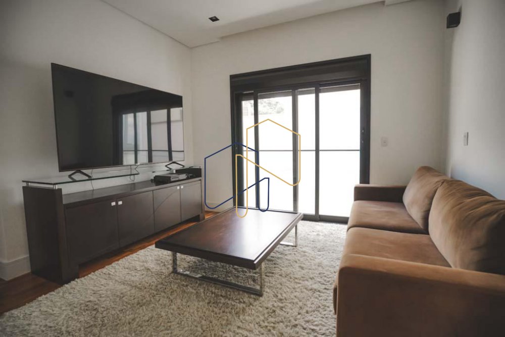 Living com pé direito duplo para três ambientes (sala de estar, jantar e TV) e frente em vidro com vista panorâmica