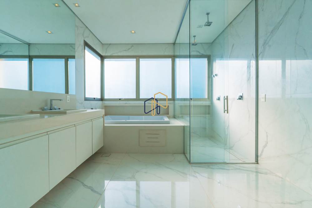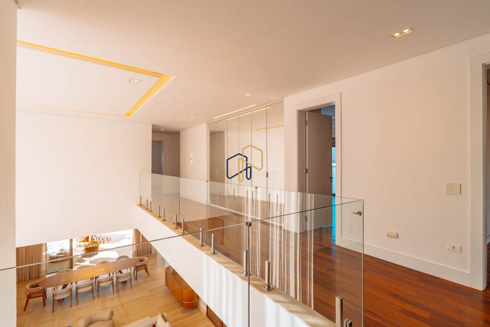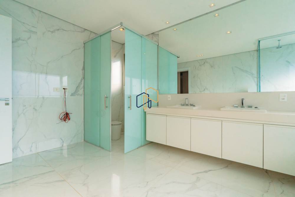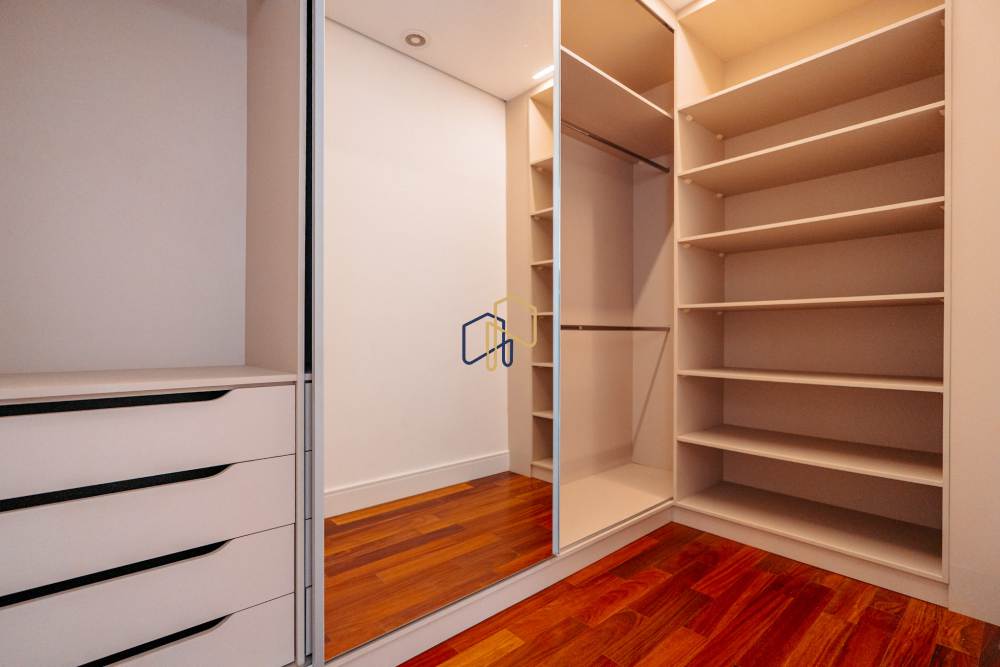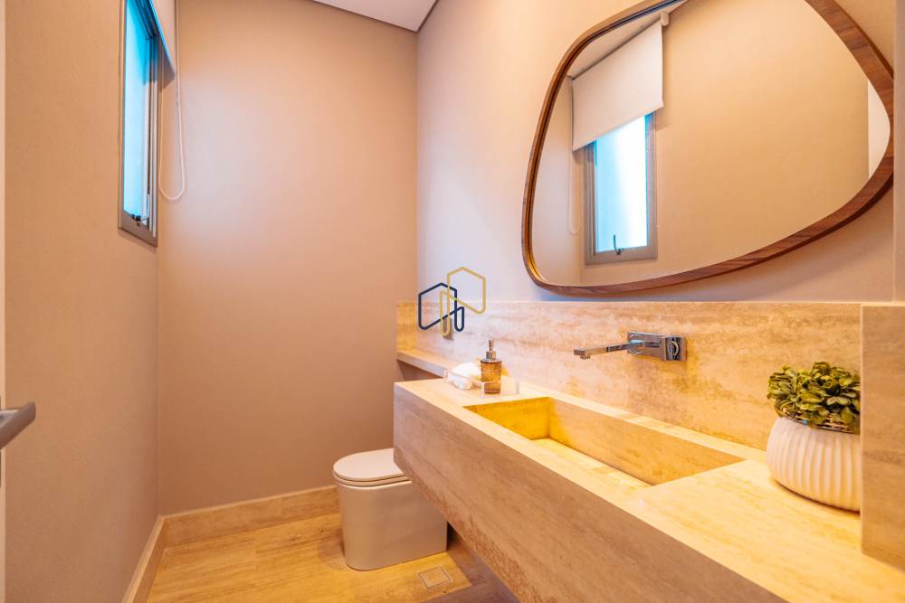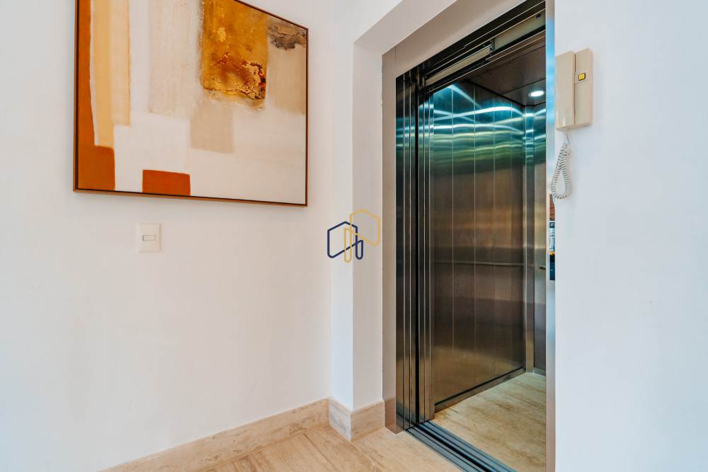 São 3 pavimentos servidos por elevador, 4 suítes sendo 1 master com Hidro Pretty Jet automatizada, bancada em QUARTZO BRANCO, 2 closets Sr. e Sra., e sala íntima. Banheiros com metais Deca, repletos de Armários. Sala íntima, Escritório, Lavabo com cuba esculpida em Mármore Travertino Navona, Área social e escada em Travertino Navona, Revestimentos Decortiles, Roca e Castelatto. Lareira em Mármore Travertino Navona Área íntima em assoalho Cumaru e Esquadrias de Alumínio linha Eurotop.