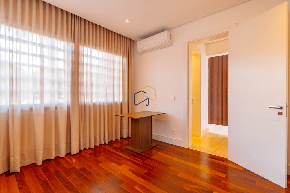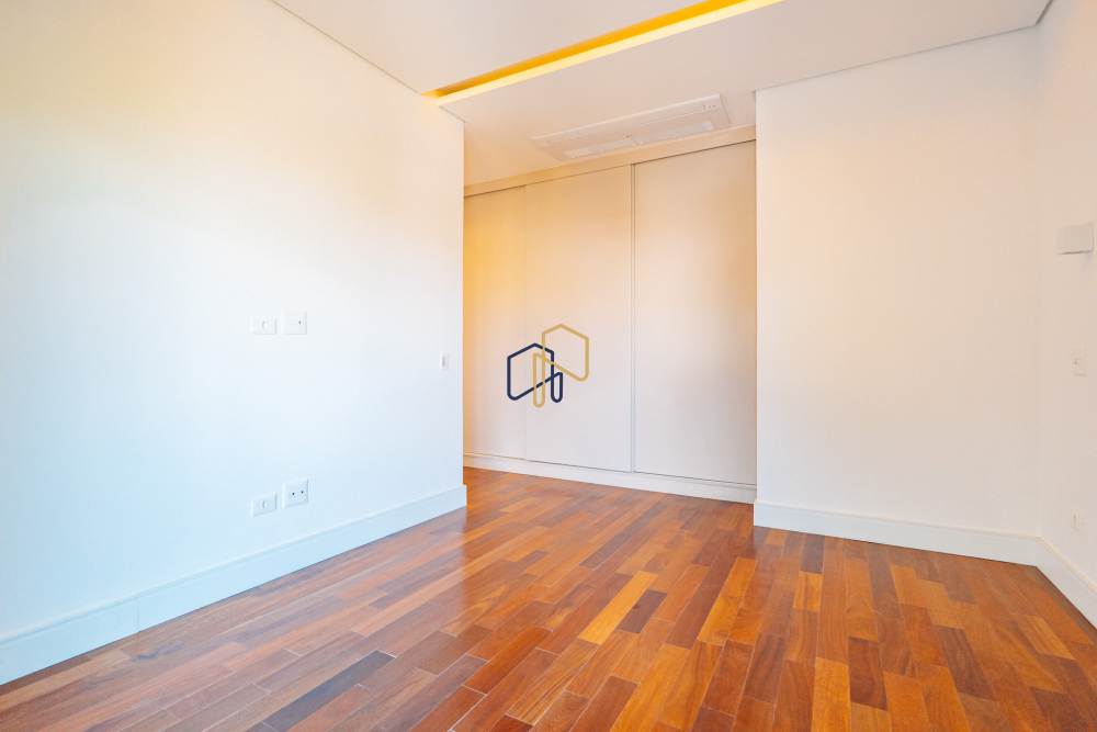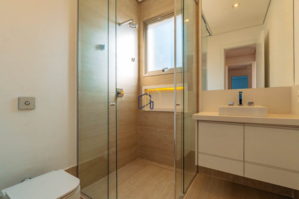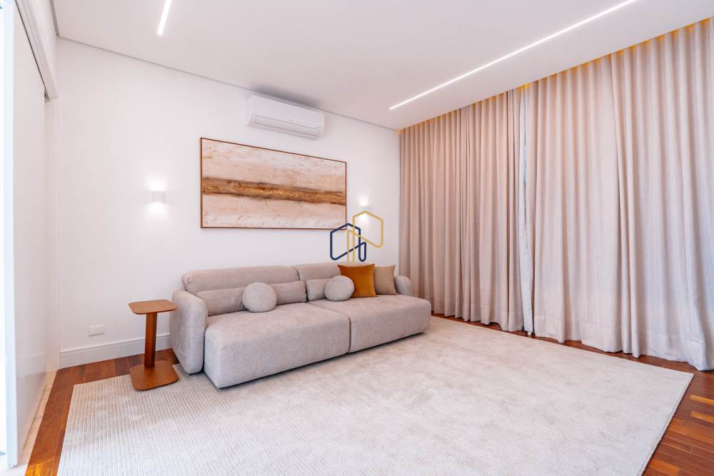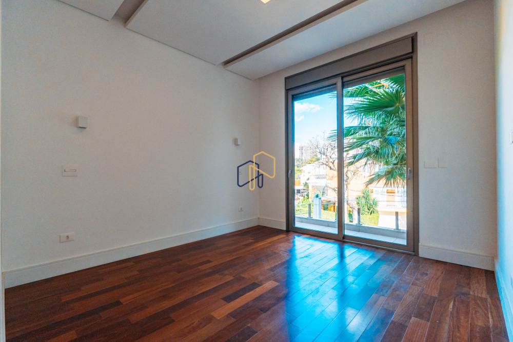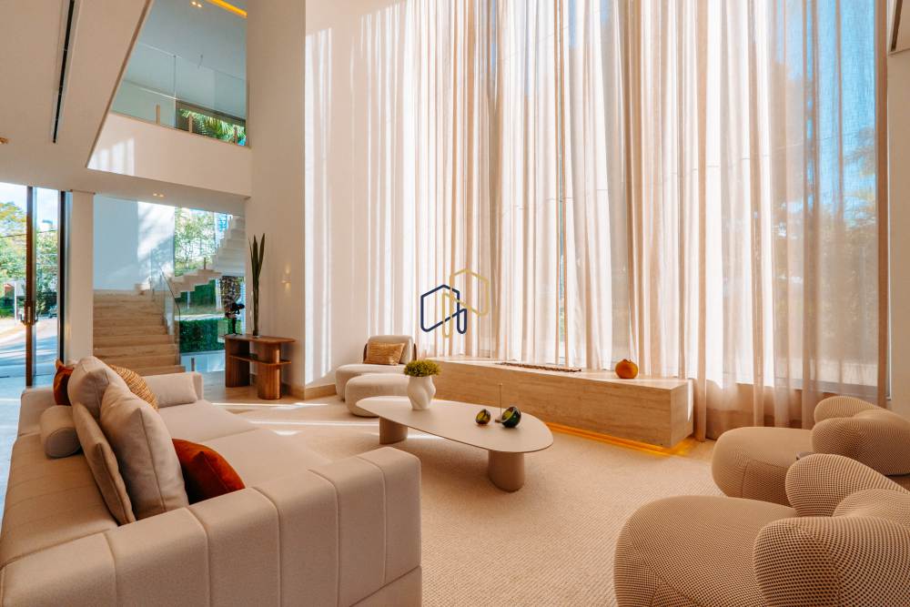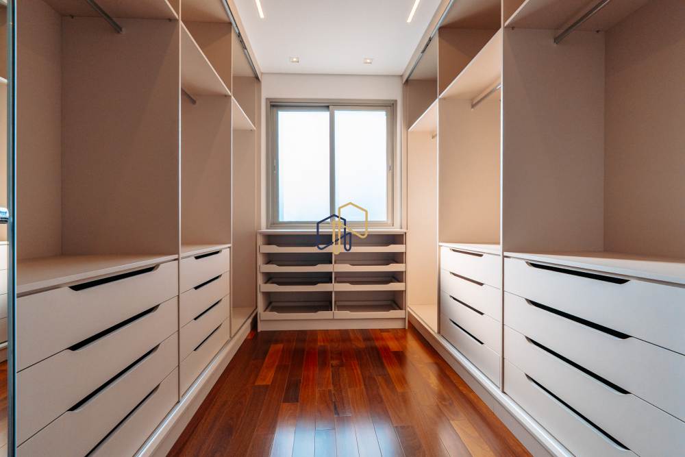 São 3 pavimentos servidos por elevador, 4 suítes sendo 1 master com Hidro Pretty Jet automatizada, bancada em QUARTZO BRANCO, 2 closets Sr. e Sra., e sala íntima. Banheiros com metais Deca, repletos de Armários. Sala íntima, Escritório, Lavabo com cuba esculpida em Mármore Travertino Navona, Área social e escada em Travertino Navona, Revestimentos Decortiles, Roca e Castelatto. Lareira em Mármore Travertino Navona Área íntima em assoalho Cumaru e Esquadrias de Alumínio linha Eurotop.