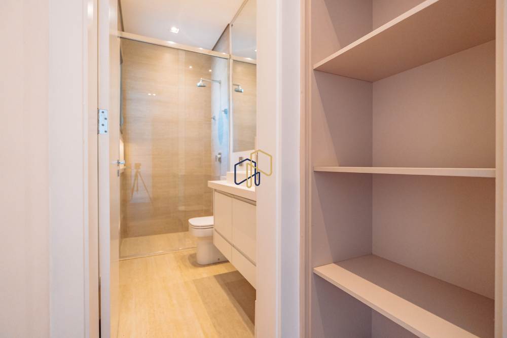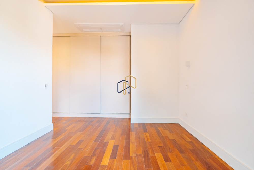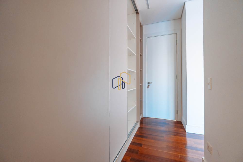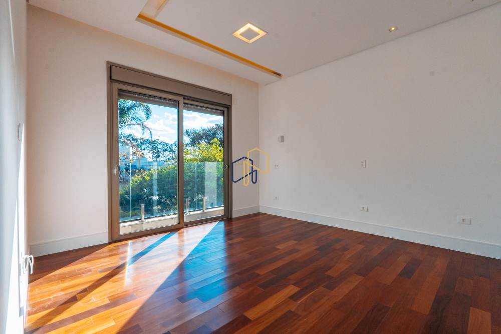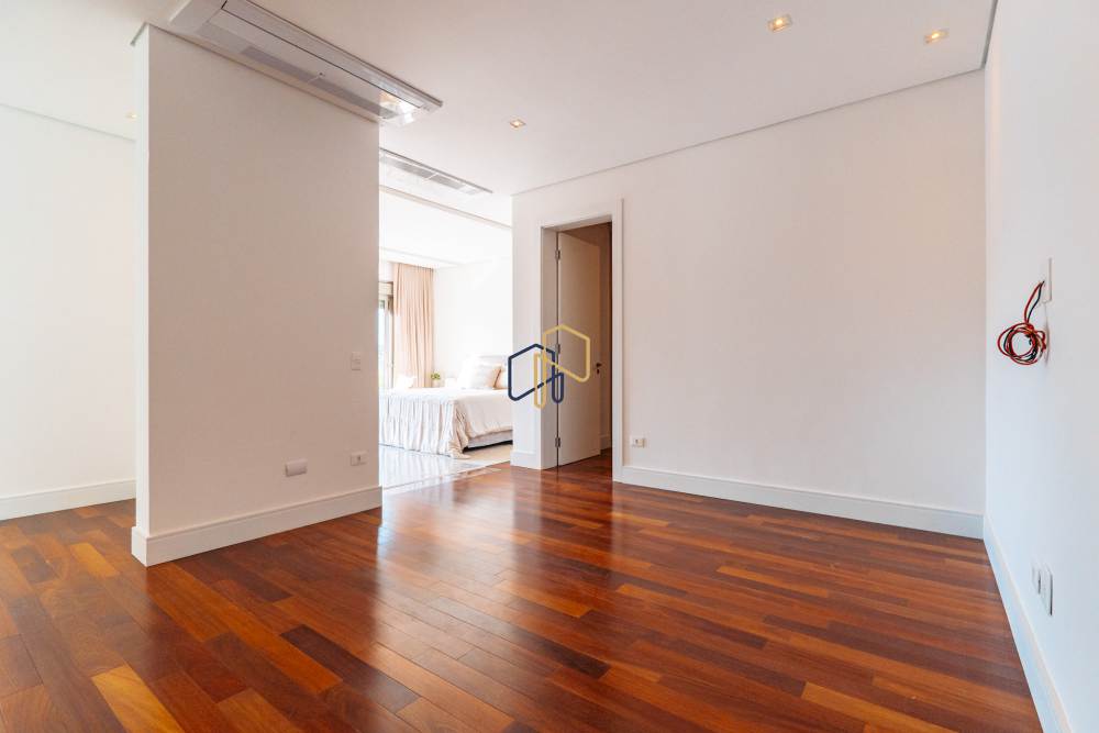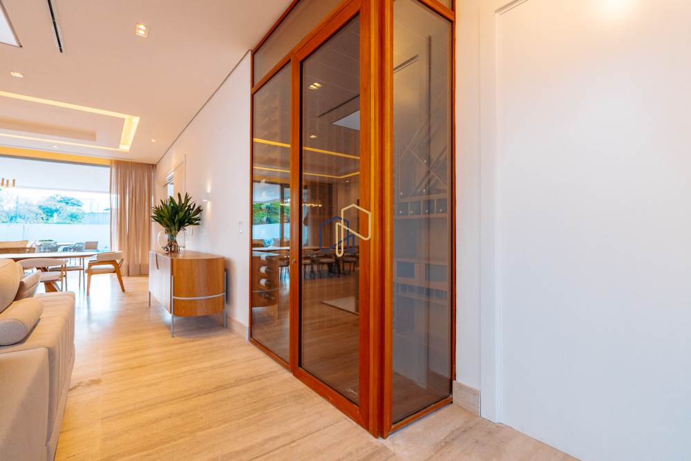São 3 pavimentos servidos por elevador, 4 suítes sendo 1 master com Hidro Pretty Jet automatizada, bancada em QUARTZO BRANCO, 2 closets Sr. e Sra., e sala íntima. Banheiros com metais Deca, repletos de Armários. Sala íntima, Escritório, Lavabo com cuba esculpida em Mármore Travertino Navona, Área social e escada em Travertino Navona, Revestimentos Decortiles, Roca e Castelatto. Lareira em Mármore Travertino Navona Área íntima em assoalho Cumaru e Esquadrias de Alumínio linha Eurotop.
