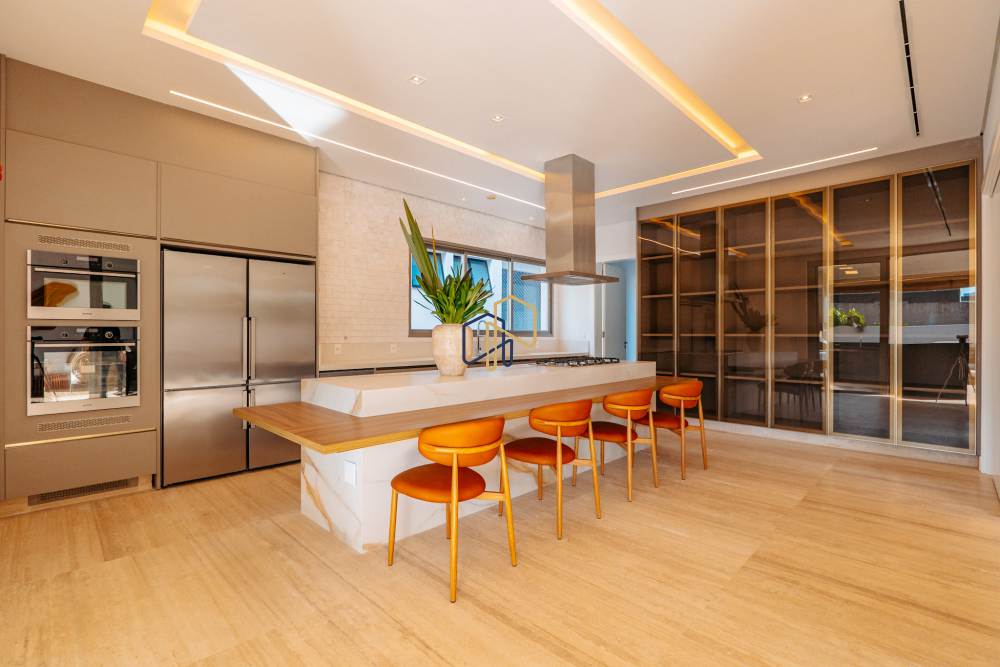 Cozinha Florense com eletrodomésticos Gorenje Linha Stark, bancadas em Quartzo e Techlam e revestimento Cubus Pigues Mosarte, Lavanderia com Máquinas de Lavar e secar, Dispensa, Louceiro, Copa intima no andar superior, Garagem para 9 carros e previsão de tomada para veículos elétricos, Depósito, Suíte de serviço, escada de serviço.