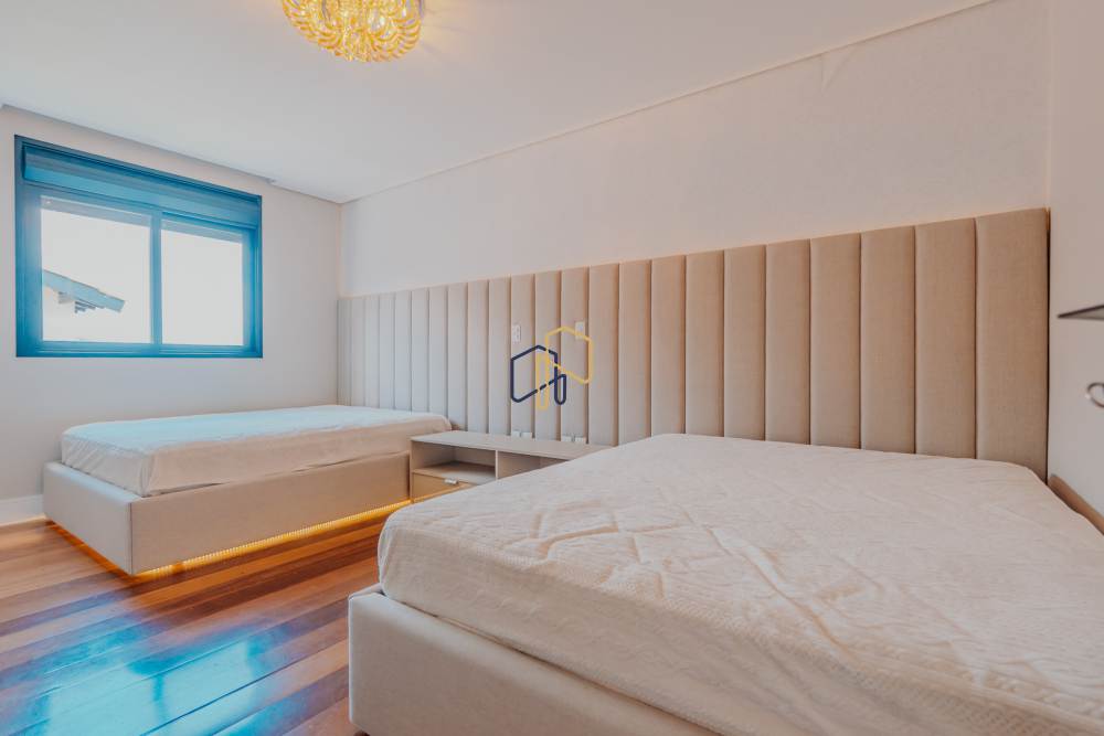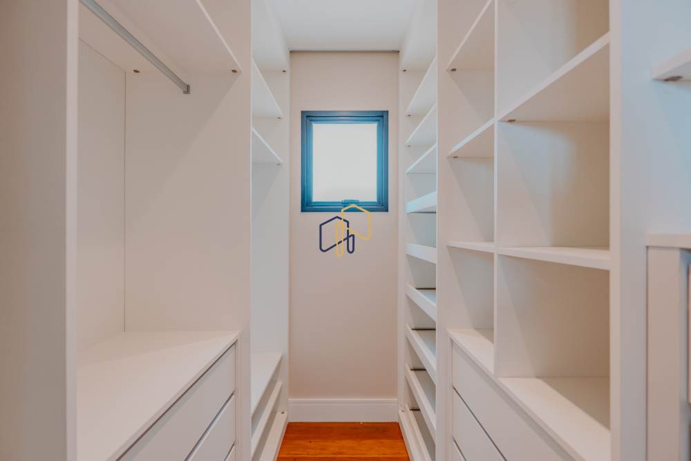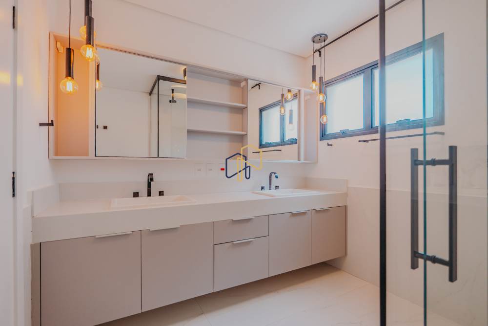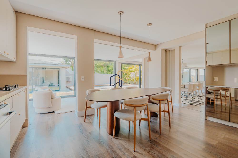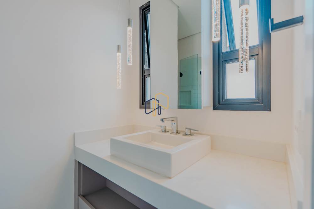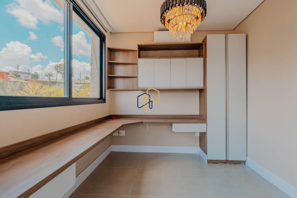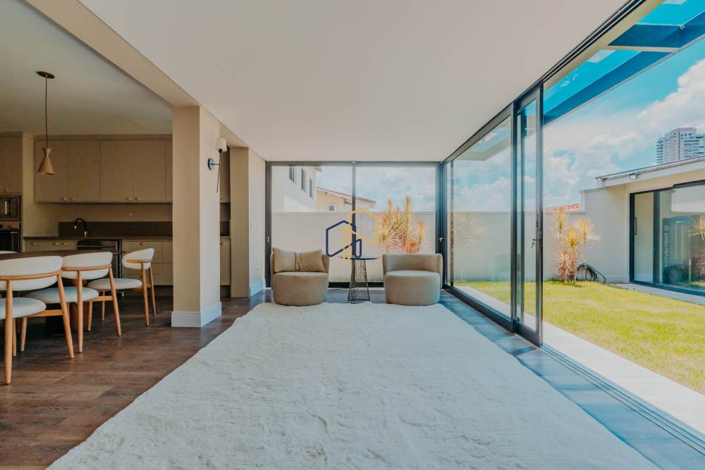 Todas esquadrias em alumínio, piso superior em madeira maciça, suítes repleta de armários e suíte master com terraço. Cozinha possui armários e despensa. Escritório com banheiro privativo no piso térreo e dependência de empregada. Lazer ensolarado integrado à piscina e espaço gourmet. Infraestrutura para energia fotovoltaica.