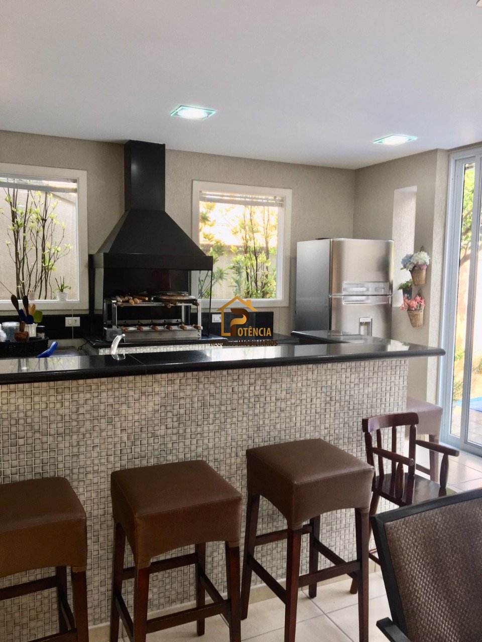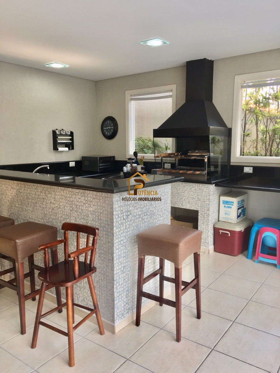 Espaço gourmet todo equipado, com churrasqueira, fogão e geladeira.