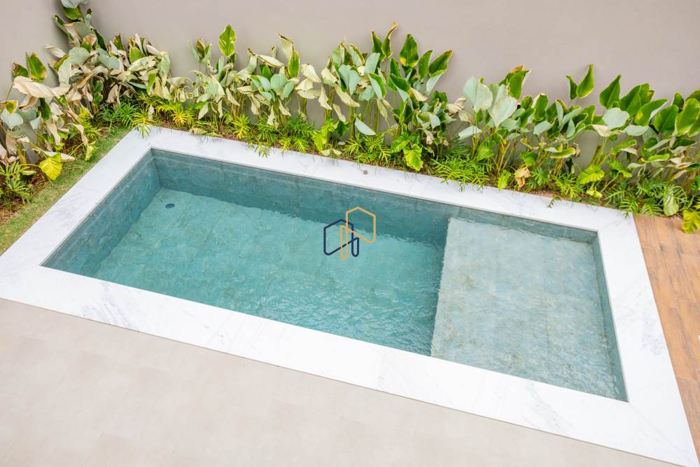 * Piscina iluminada e churrasqueira em espaço de lazer aconchegante