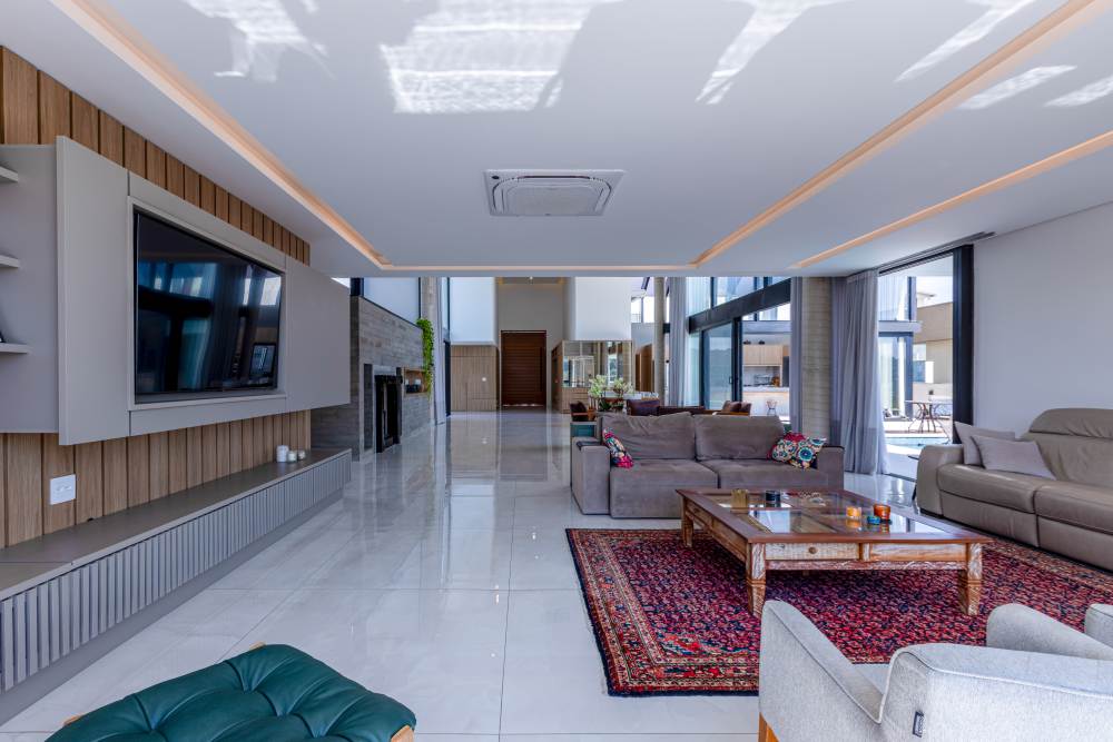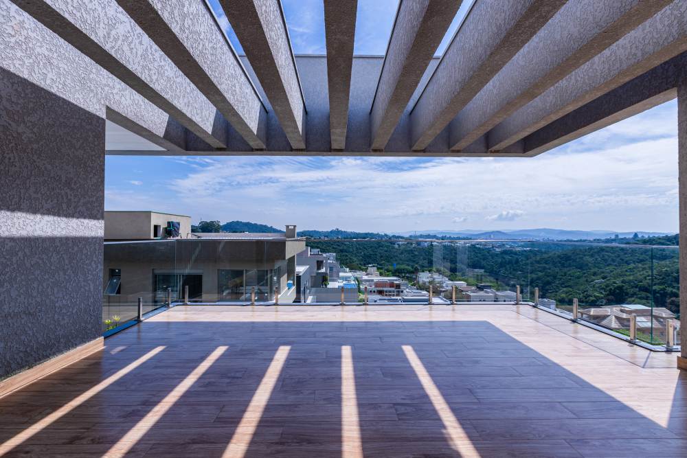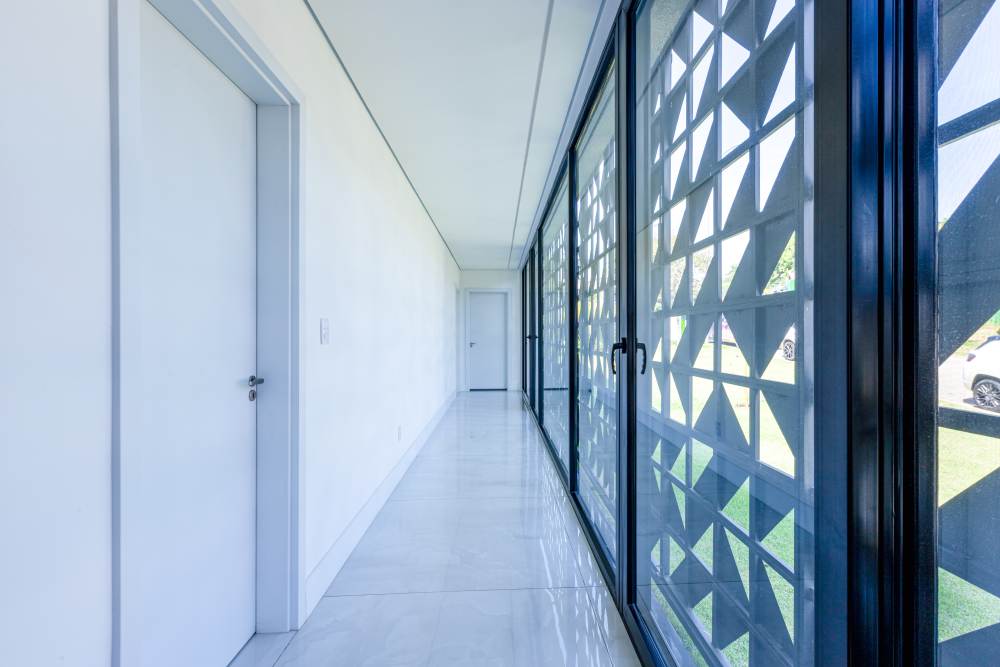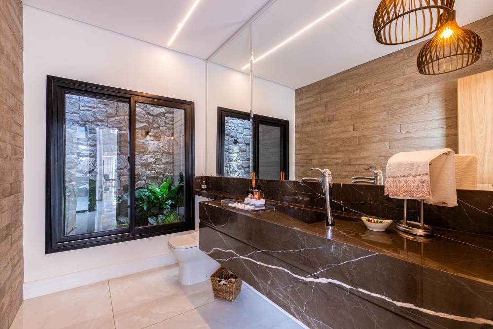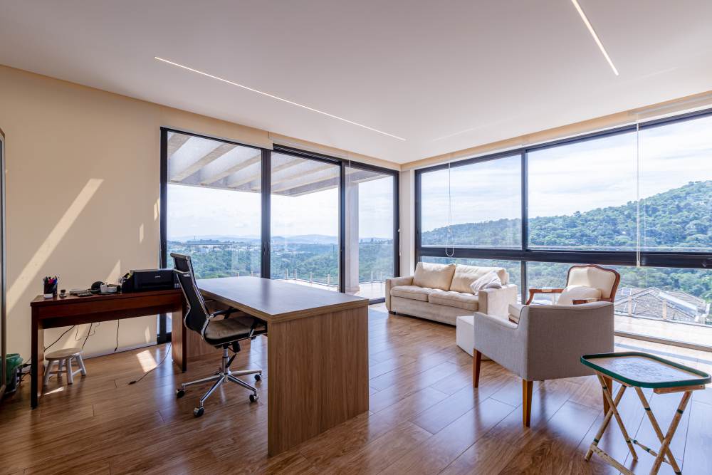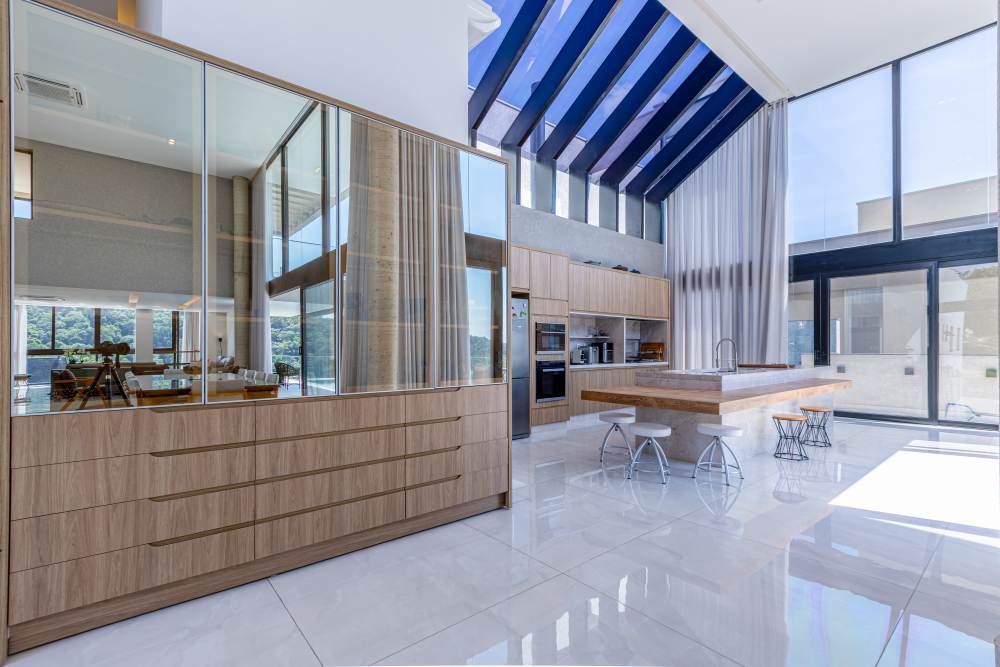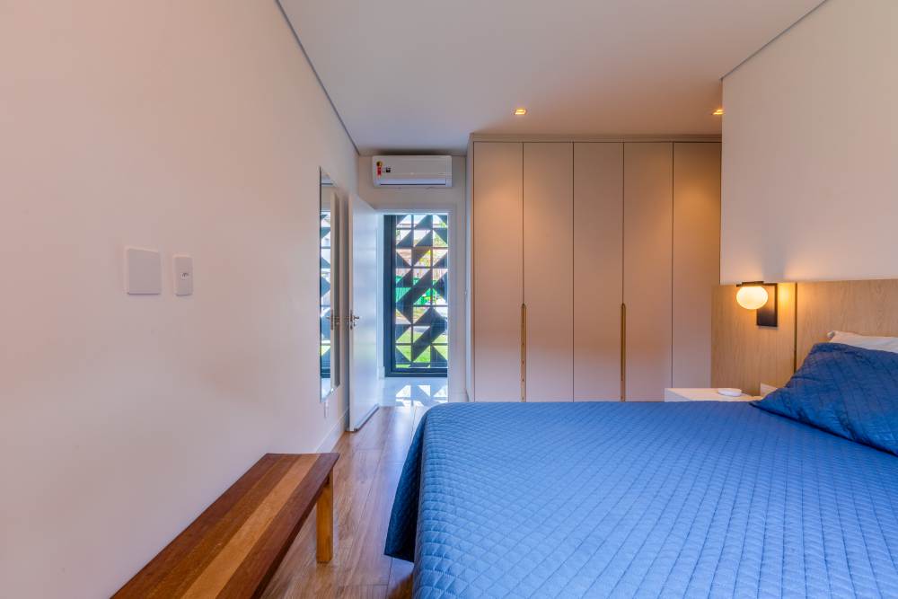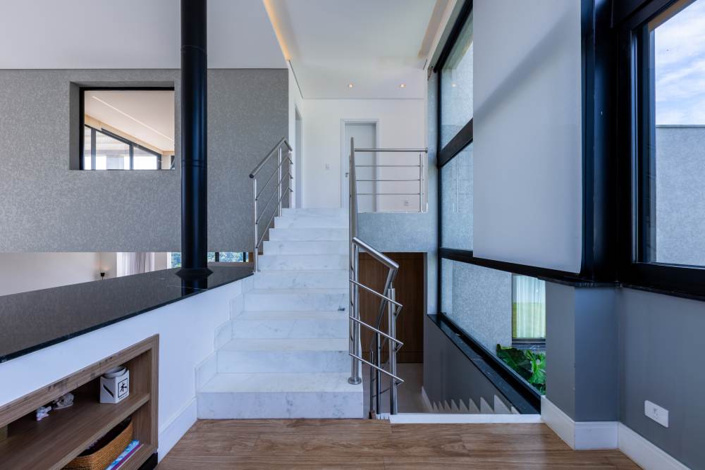 Para total conveniência, a casa conta com infraestrutura de automação, energia fotovoltaica que cobre 90% do consumo, aquecimento solar, elevador para quatro pessoas e ar-condicionado em todos os ambientes. As persianas elétricas garantem praticidade e conforto térmico.