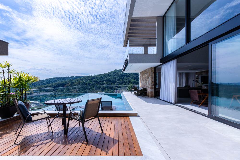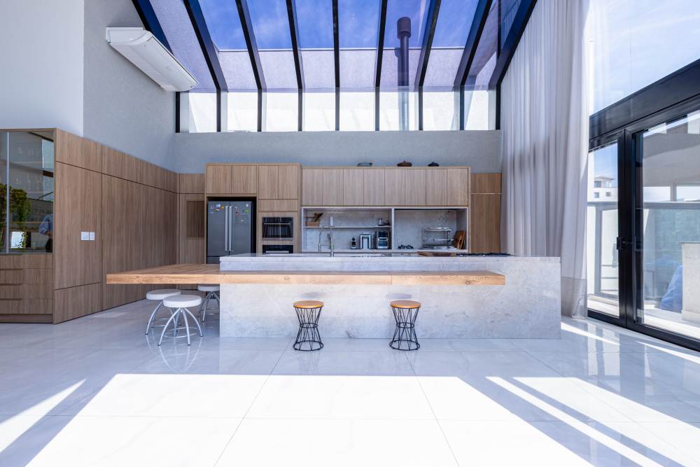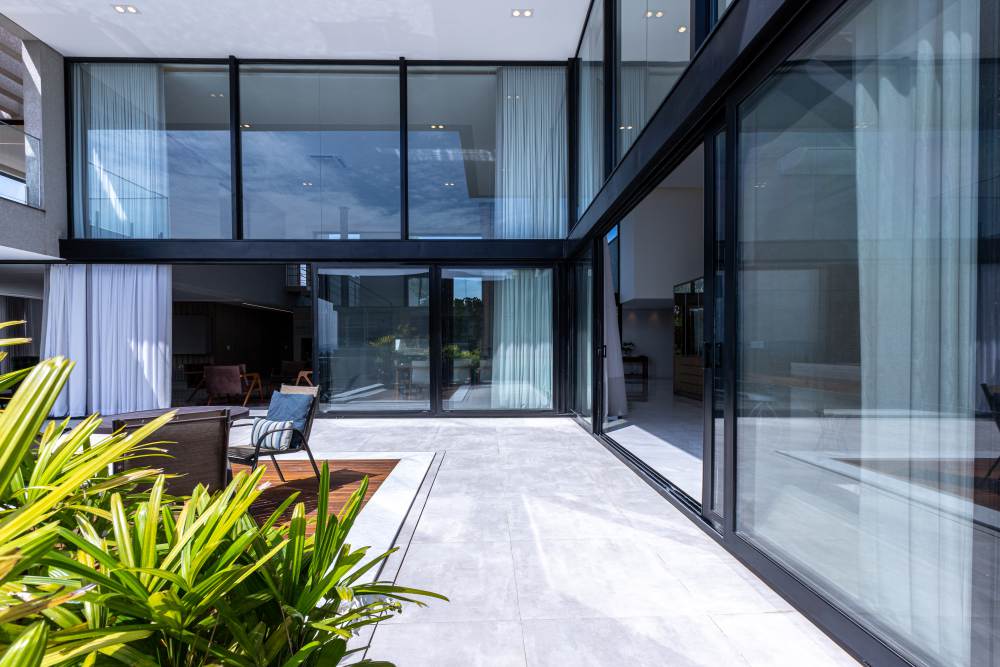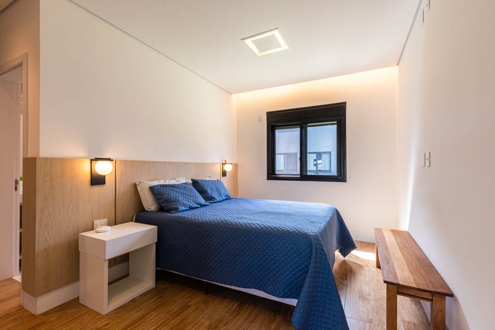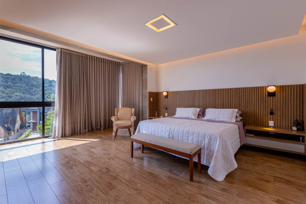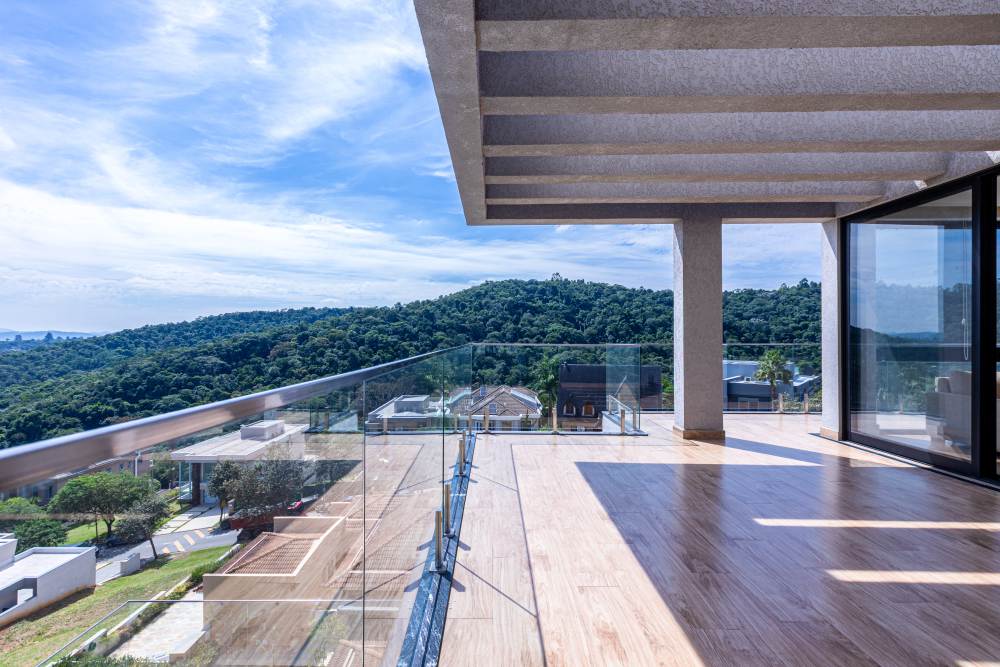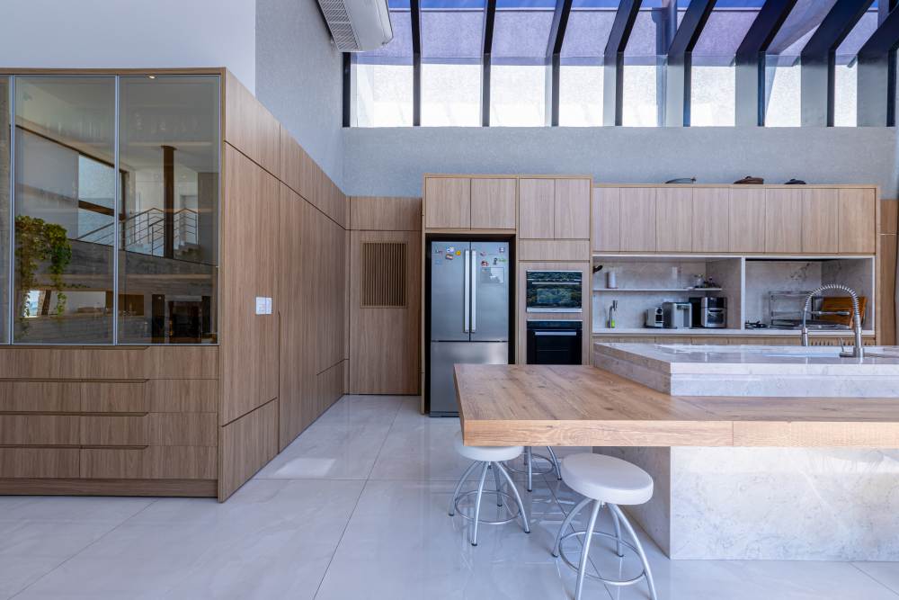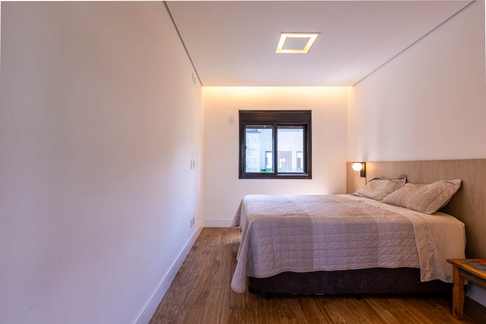 Para total conveniência, a casa conta com infraestrutura de automação, energia fotovoltaica que cobre 90% do consumo, aquecimento solar, elevador para quatro pessoas e ar-condicionado em todos os ambientes. As persianas elétricas garantem praticidade e conforto térmico.