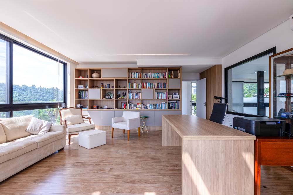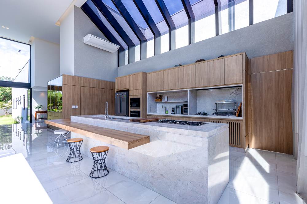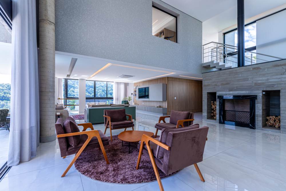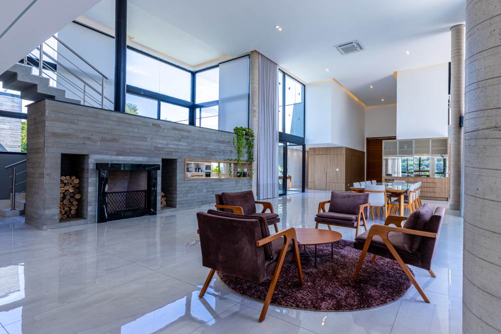 A área social impressiona com um living totalmente integrado para quatro ambientes, incluindo uma sala de lareira a lenha, sala de jantar e estar com pé-direito duplo, proporcionando elegância e amplitude ao espaço.