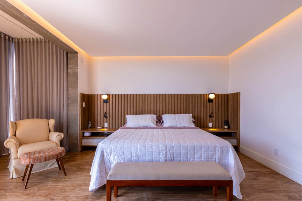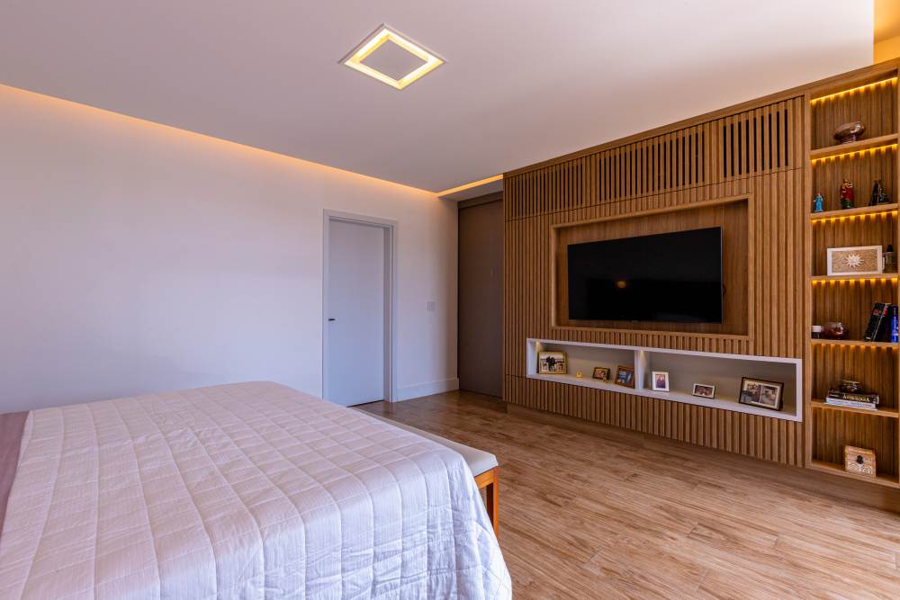 O imóvel oferece quatro suítes cuidadosamente projetadas, todas com closets e móveis planejados, além de duas suítes com hidromassagem. A Suíte Master se destaca com banheiros Sr. e Sra., garantindo privacidade e exclusividade.