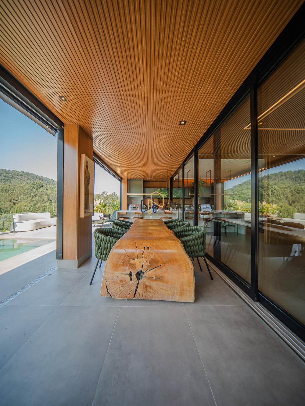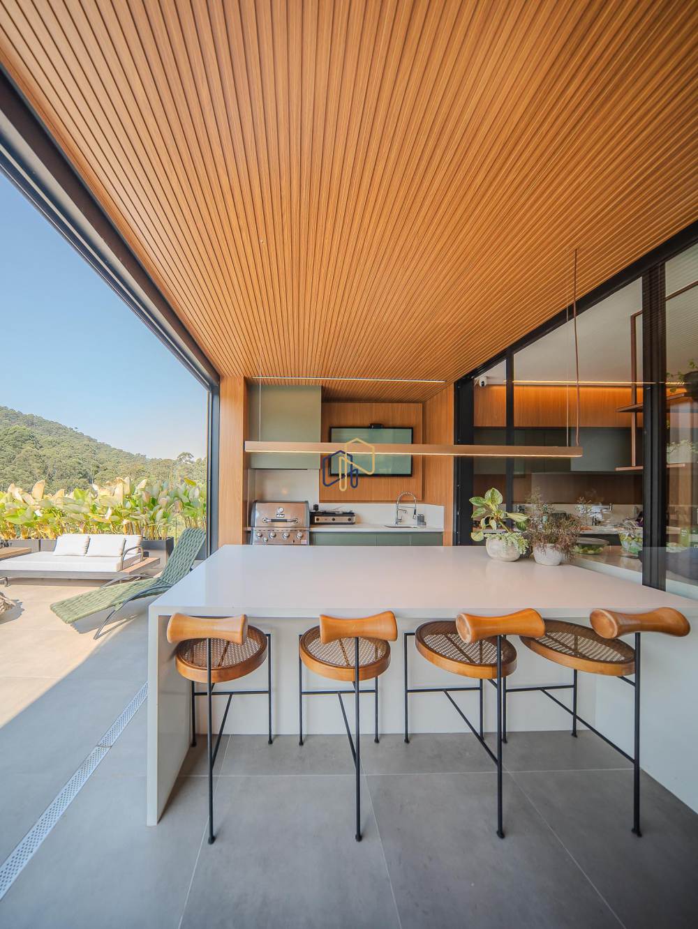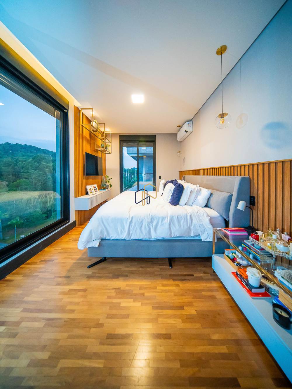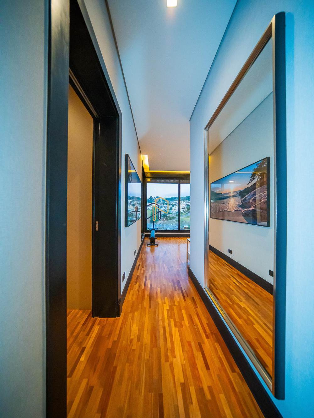 Além disso, você poderá desfrutar de um living com pé direito duplo, escritório ou brinquedoteca, adega climatizada revestida em pedra moledo , home theater, sala de estar com lareira a gás revestida em pedra moledo, sala de almoço integrada com a cozinha americana e um terraço gourmet com churrasqueira a gás e vista incrível