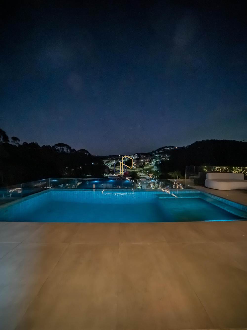 A área externa conta com uma piscina de borda infinita e spa, perfeita para relaxar e aproveitar a vista.