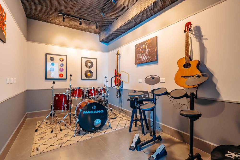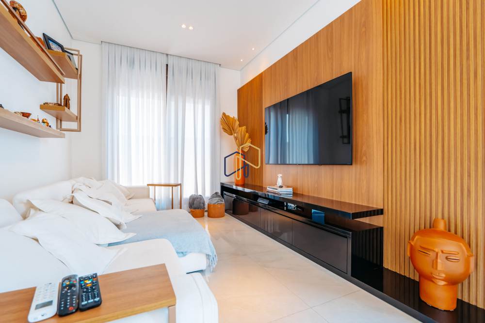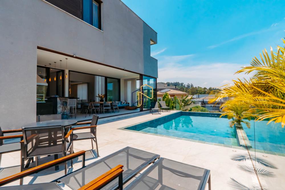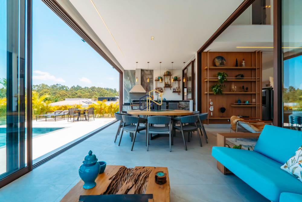 A área social é ampla e totalmente voltada para a vista verde, com sala de estar com pé-direito duplo, lareira e ambientes integrados à área gourmet e à piscina aquecida com prainha e borda infinita.