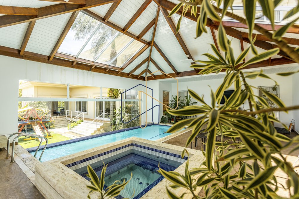 Piscina com cobertura retrátil e jacuzzi.