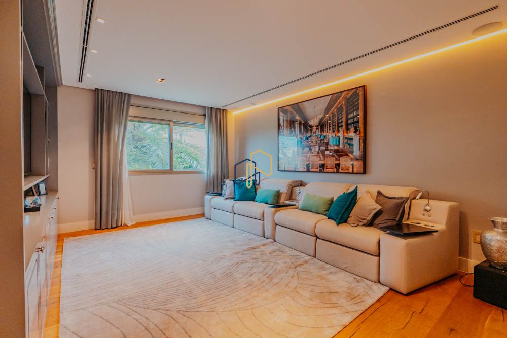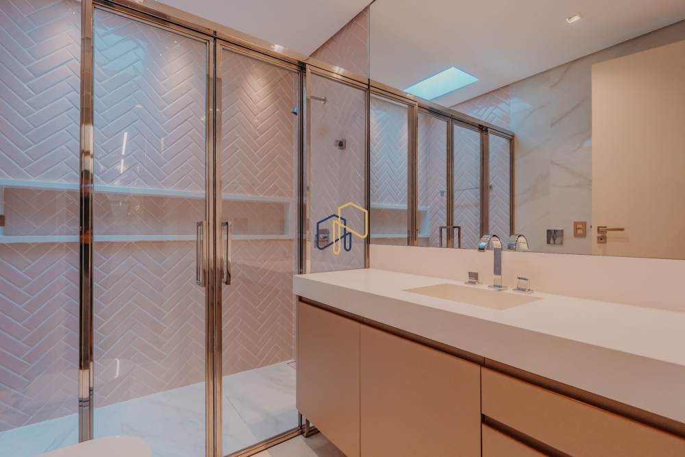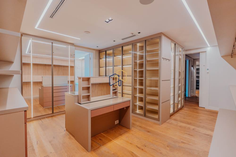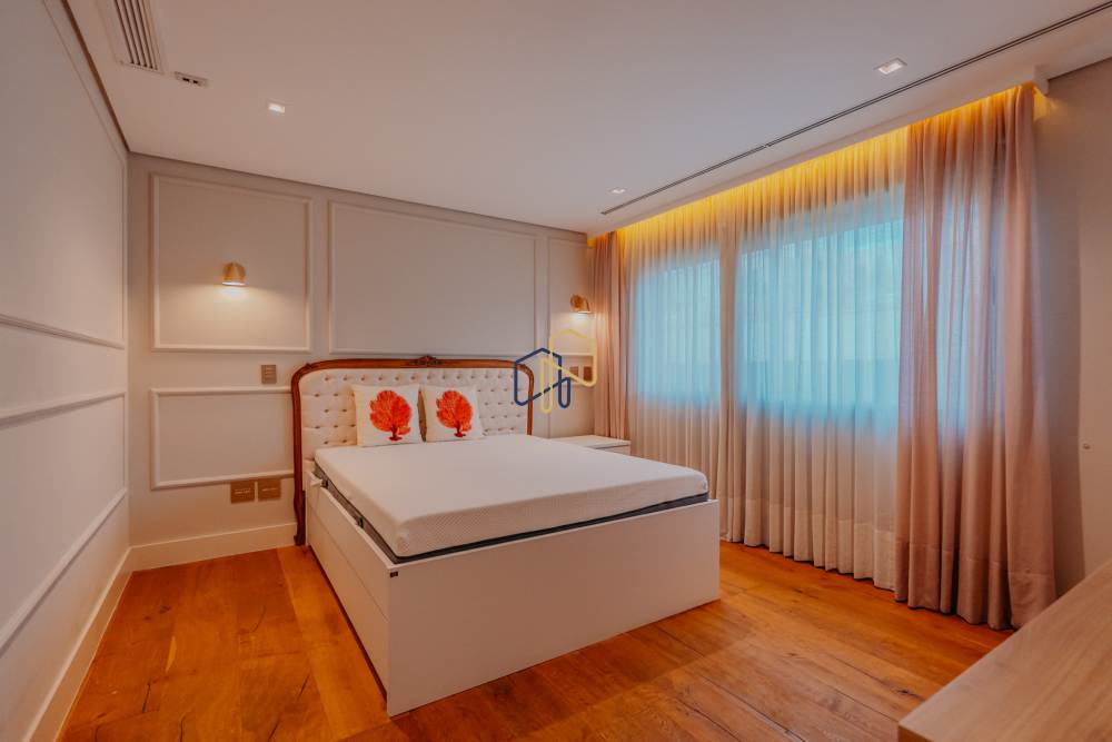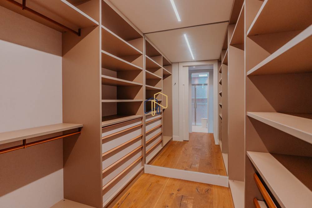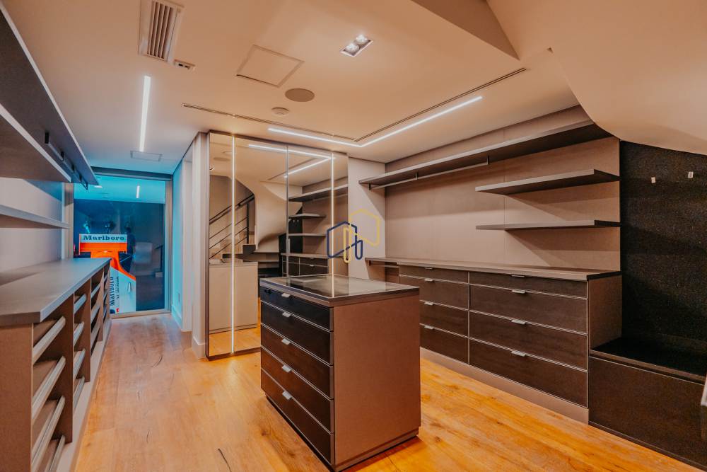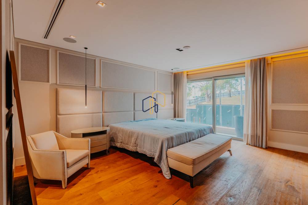 A área íntima é marcada pela Suíte Master, que conta com antesala, closets independentes para Sr. e Sra., além de banheiros exclusivos. São seis suítes ao todo, garantindo privacidade e conforto para toda a família e convidados.