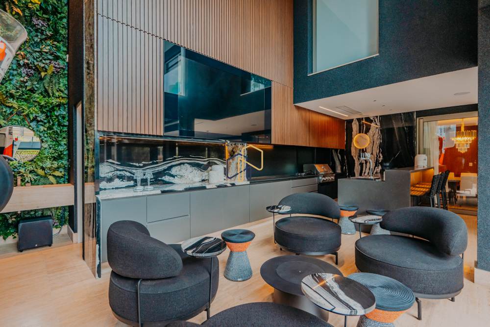 O projeto contempla aquecimento solar, piscina aquecida e ar-condicionado central, criando ambientes climatizados e acolhedores em todas as estações. Para maior comodidade, a casa dispõe de elevador e irrigação automática no jardim, que embeleza o espaço externo com três gazebos assinados pela Arthur Decor — um deles com teto retrátil e outro com persianas e cobertura automatizada.